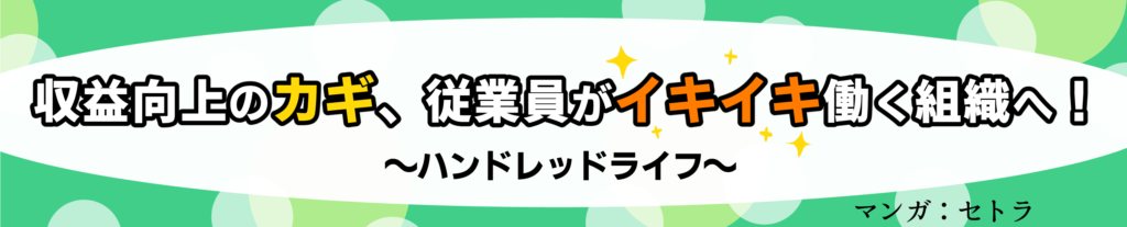 ハンドレッドライフは、従業員の健康と幸福を促進し、彼らがイキイキと働ける環境を整えることのお手伝いをします。ウェルビーイングな健康経営関連のホームページを開設に伴いマンガ「収益向上のカギ、従業員がイキイキ働く組織へ!」を1コマずつ定期的に再掲載させていただきますので良ければ見てください!