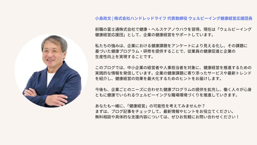 • 教育と意識改革:健康に関する知識を従業員に伝える教育プログラムを定期的に実施します。