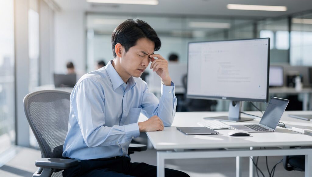 眼精疲労は単なる疲れではなく、集中力や判断力の低下を通じて業務の質を落とします。その結果、ミスの増加や作業効率の悪化が起こり、企業の生産性に直接影響します。本人は「いつも通り働いている」つもりでも、実際にはパフォーマンスが落ちている状態になりやすい点が問題です。