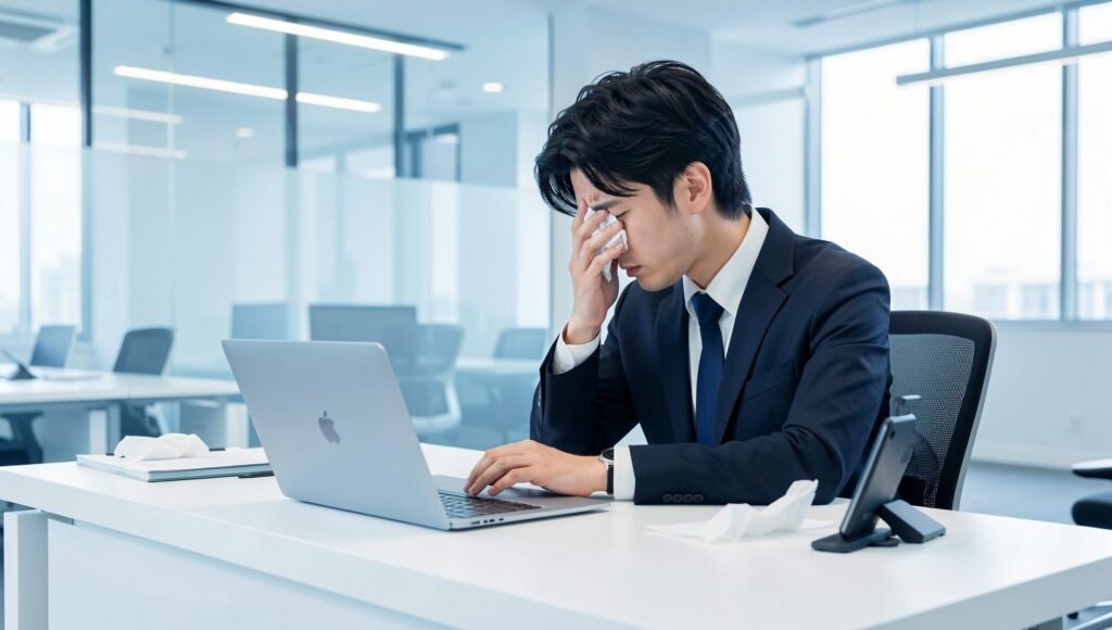 花粉症は重症化しても欠勤には至らず、出勤しながら我慢して働く人が多いのが特徴です。その結果、花粉症によるプレゼンティーイズム影響が表面化せず、企業側も問題として認識しにくくなります。しかし実際は集中力低下や判断ミスが増え、業務品質の低下につながります。